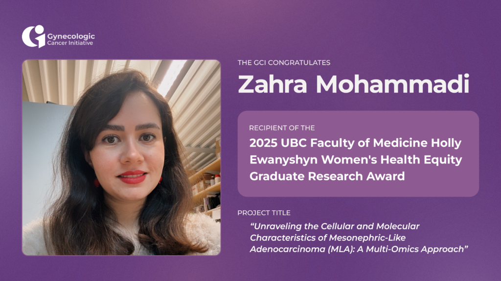Congratulations to GCI Trainee Zahra Mohammadi on recently receiving the 2025 UBC Faculty of Medicine Holly Ewanyshyn Women’s Health Equity Graduate Research Award for her project titled, “Unraveling the Cellular and Molecular Characteristics of Mesonephric-Like Adenocarcinoma (MLA): A Multi-Omics Approach.” Zahra is a second year PhD student in the Women+ and Children’s Health Sciences program (Dept. ObGyn) at University of British Columbia.